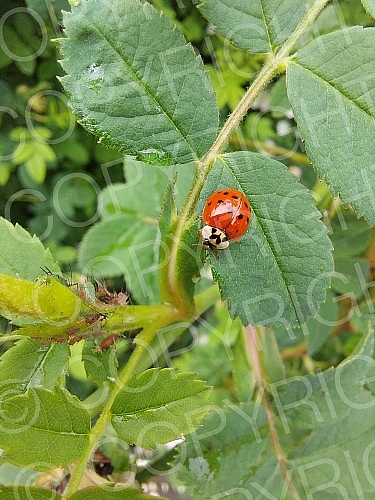 Ladybug (coccinella magnifica) on leafs eating aphids. Bubamara (coccinella magnifica) na liscu jede biljne vasi.