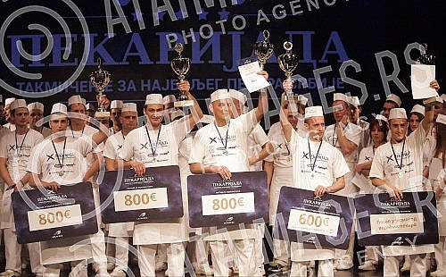 - Description: 20, April, 2016, Belgrade - "Pekarijada 2016" , a solemn declaration of the best bakers of Serbia in five categories - best in preparing traditional enriched bread is Lazar Milanov , in preparing of burek (the pasty) Marjan Jerinic , flat bread Srdjan Stojanovic and buns with jam Marko Zivkovic. The title of "best young bakers took Nenad Radovanovic. Photo: A. K./ATAImages 20, april, 2016, Beograd - Pekarijada 2016, svecano proglasenje najboljih pekara Srbije u pet kategorija najbolji u pripremanju tradicionalnog obogacenog hleba je Lazar Milanov, u pripremanju bureka je Marjan Jerinic, somuna Srdjan Stojanovic, a buhtle sa dzemom Marko Zivkovic. Titulu najboljeg mladog pekara poneo je Nenad Radovanovic. Foto: A. K./ATAImages